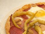 | Bauern Pizza mit rohem Schinken, Champignons, Eier und Peperoni |